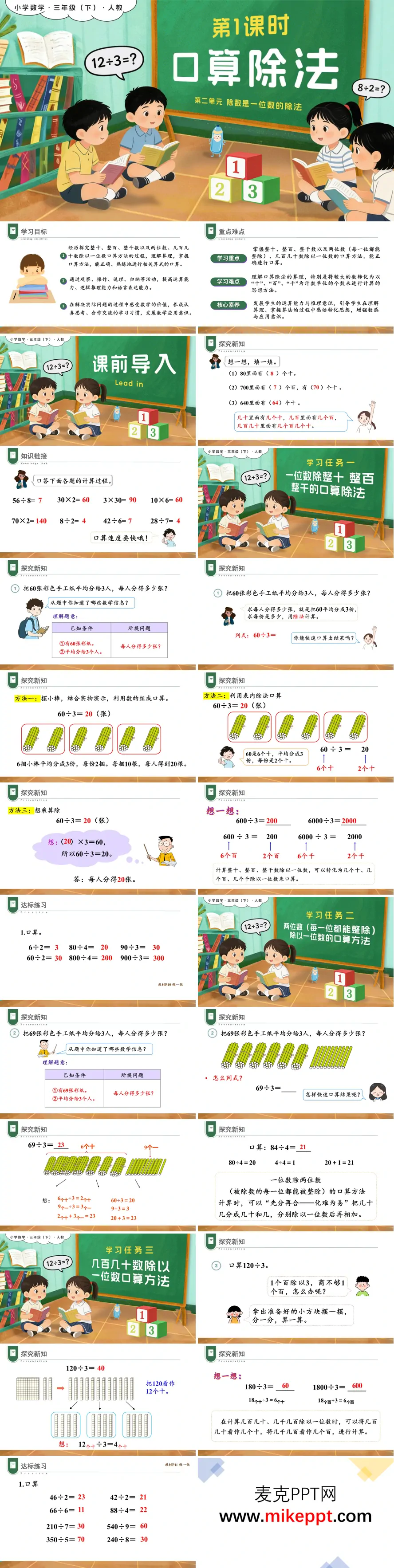 本課為人教版小學(xué)數(shù)學(xué)三年級下冊《口算除法》教學(xué)設(shè)計,整體采用活潑生動的課堂場景插畫風格,充分契合小學(xué)生的認知特點與學(xué)習興趣。課程內(nèi)容緊扣"除數(shù)是一位數(shù)的除法"這一核心主題,從課前導(dǎo)入環(huán)節(jié)的舊知回顧自然切入,借助"60張彩色手工紙平均分給3人"等貼近生活的實例,引導(dǎo)學(xué)生自主探究整十、整百、整千數(shù)除以一位數(shù)的多種口算策略,包括擺小棒直觀操作、利用表內(nèi)除法遷移以及想乘算除等靈活方法。隨后教學(xué)逐步深入,過渡到兩位數(shù)(每位均能整除)及幾百幾十數(shù)除以一位數(shù)的口算學(xué)習,如69÷3、120÷3等典型例題,著重滲透"先分再合、化難為易"的數(shù)學(xué)思維。課件還精心設(shè)計了層次豐富的達標練習與課堂鞏固環(huán)節(jié),內(nèi)容涵蓋基礎(chǔ)口算訓(xùn)練、數(shù)學(xué)規(guī)律探究以及實際應(yīng)用問題解決,幫助學(xué)生扎實掌握計算方法、主動發(fā)現(xiàn)運算規(guī)律。最后通過系統(tǒng)的知識總結(jié)與分層課后作業(yè),引導(dǎo)學(xué)生自主梳理知識脈絡(luò)、嘗試繪制思維導(dǎo)圖,全面培養(yǎng)運算能力與推理意識,實現(xiàn)數(shù)學(xué)素養(yǎng)的系統(tǒng)性提升。