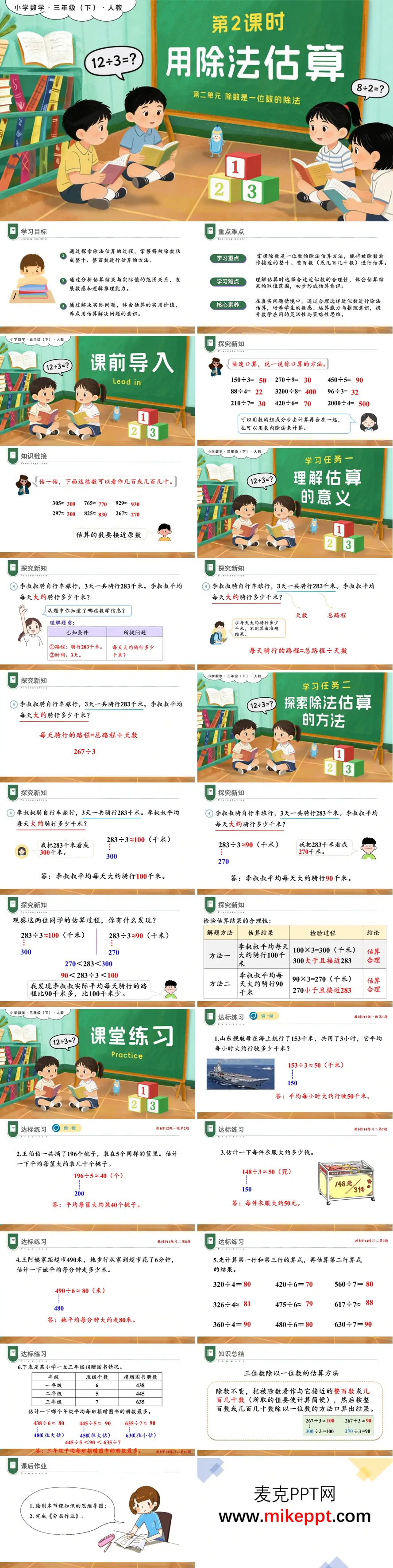本課為人教版小學(xué)數(shù)學(xué)三年級(jí)下冊(cè)《用除法估算》教學(xué)設(shè)計(jì),整體采用活潑生動(dòng)的課堂場(chǎng)景插畫風(fēng)格,充分契合小學(xué)生的認(rèn)知特點(diǎn)與思維水平。課程內(nèi)容圍繞"除數(shù)是一位數(shù)的除法"估算方法展開,從課前導(dǎo)入環(huán)節(jié)的舊知回顧入手,先組織學(xué)生進(jìn)行快速口算熱身,再通過"估一估數(shù)可以看作幾百或幾百幾十"的專項(xiàng)練習(xí),幫助學(xué)生初步建立估算意識(shí)、理解估算的實(shí)際價(jià)值。新知探究環(huán)節(jié)以"李叔叔3天騎行283千米,平均每天大約騎行多少千米"這一真實(shí)問題為驅(qū)動(dòng),引導(dǎo)學(xué)生自主探索兩種不同的估算策略:將283看作整百數(shù)300,得到商約100千米;或?qū)?83看作幾百幾十?dāng)?shù)270,得到商約90千米,并通過實(shí)際檢驗(yàn)分析兩種結(jié)果的合理性,使學(xué)生深刻體會(huì)到準(zhǔn)確值介于90至100千米之間的數(shù)學(xué)本質(zhì)。課件還精心設(shè)計(jì)了航海里程、摘桃數(shù)量、購(gòu)物預(yù)算等豐富多樣的達(dá)標(biāo)練習(xí),引導(dǎo)學(xué)生在真實(shí)情境中靈活應(yīng)用估算方法解決問題。最后通過系統(tǒng)的知識(shí)總結(jié)與分層課后作業(yè),幫助學(xué)生梳理三位數(shù)除以一位數(shù)的估算思路,切實(shí)培養(yǎng)數(shù)感與解決實(shí)際問題的綜合能力。