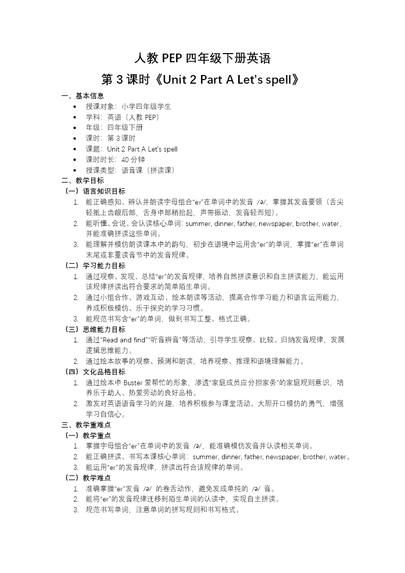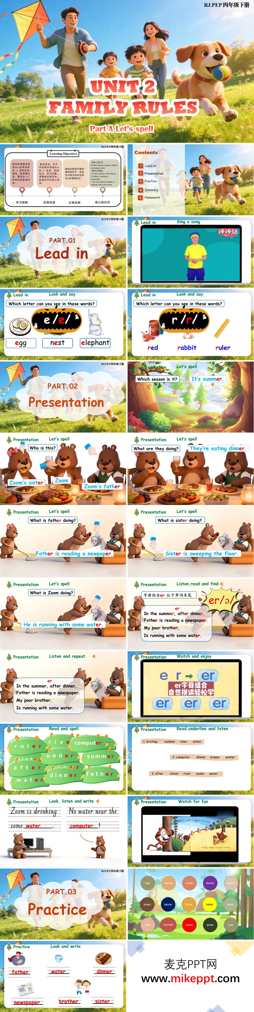 這是一份為人教版PEP四年級下冊Unit 2《Family Rules》Part A Let's spell板塊精心打造的語音教學演示文稿,整份課件以字母組合er的發(fā)音規(guī)律探究為核心目標,板塊設計清晰完整,教學活動環(huán)環(huán)相扣,充分體現(xiàn)了自然拼讀法的教學理念與語音知識的系統(tǒng)化建構。 課件以導入環(huán)節(jié)開啟學習,首先運用節(jié)奏歡快的歌曲進行課堂熱身,迅速調動學生的學習積極性;繼而回顧字母e和r的單個發(fā)音,以舊知為支點自然過渡到er組合的發(fā)音學習,幫助學生建立字母與字母組合之間的發(fā)音關聯(lián),實現(xiàn)語音知識的正向遷移。 新知呈現(xiàn)環(huán)節(jié)巧妙創(chuàng)設Zoom一家的晚餐后生活場景,以生動形象的歌謠"In the summer, after dinner..."為語言載體,引導學生在韻律誦讀中自主感知er發(fā)/?/輕讀短音的發(fā)音規(guī)律。課件系統(tǒng)列舉brother、ruler、computer、teacher、dinner等核心例詞,通過大量語音輸入幫助學生建立音形對應關系。與此同時,教師有機結合現(xiàn)在進行時句型,如"Father is reading a newspaper.""Mother is cooking dinner."等,讓學生在真實語境中感知er發(fā)音,實現(xiàn)語音學習與語法運用的有機融合。該環(huán)節(jié)還配套設計聽讀模仿、圈畫er組合、拼寫練習等多樣化活動,從聽覺辨識、視覺識別到動手書寫,多維度強化學生的語音記憶與拼寫能力。 操練環(huán)節(jié)設計層次分明的鞏固任務:通過"Look and write"看圖寫詞活動,培養(yǎng)學生根據(jù)圖片提示和發(fā)音規(guī)律準確拼寫含er單詞的能力;借助趣味分類游戲,引導學生在單詞歸類中進一步識別er組合的發(fā)音特征,鞏固發(fā)音規(guī)則與詞匯拼寫的內在聯(lián)系,提升見詞能讀、聽音能寫的語音技能。 總結環(huán)節(jié)系統(tǒng)梳理er發(fā)/?/音的發(fā)音規(guī)律,并以詞匯網(wǎng)絡或思維導圖的形式呈現(xiàn)核心例詞,幫助學生形成結構化的語音知識框架,實現(xiàn)從分散感知到系統(tǒng)認知的躍升。作業(yè)布置注重語音知識的遷移運用,分層設計聽讀模仿、規(guī)范拼寫練習及故事朗讀等任務:基礎層側重標準發(fā)音的聽讀訓練,確保語音輸入的準確性;提升層鼓勵學生朗讀含有多個er詞匯的趣味小故事,在語篇情境中綜合運用發(fā)音規(guī)律,真正實現(xiàn)語音知識的內化與遷移,為學生終身英語學習能力的發(fā)展奠定堅實基礎。