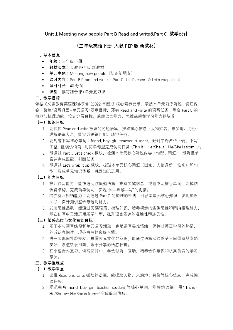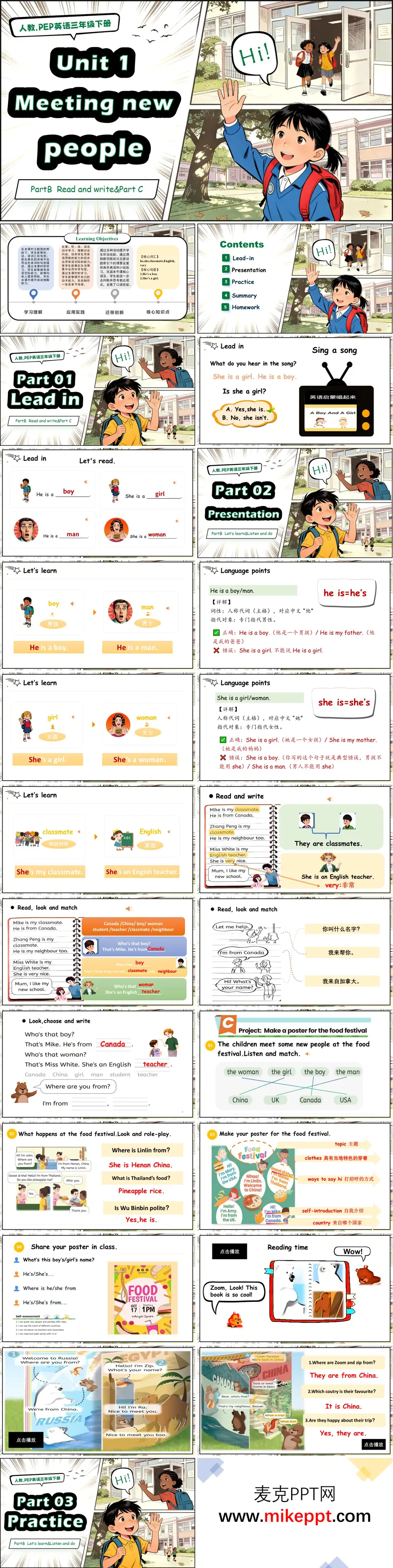 本課時課件圍繞人教PEP版三年級上冊Unit 1單元主題,構(gòu)建"激活—建構(gòu)—內(nèi)化—遷移"的完整教學(xué)鏈條。課堂以歌曲熱身喚醒已有經(jīng)驗,自然切入boy、girl、man、woman等核心詞匯及He's/She's縮寫句型的學(xué)習。新知呈現(xiàn)借助圖文配對、情境問答與語音模仿,幫助學(xué)生在語境中建立音形義關(guān)聯(lián),并針對性別表達與縮寫規(guī)則進行重點辨析,化解易錯難點。操練環(huán)節(jié)梯度分明:看圖匹配、選詞填空夯實語言基礎(chǔ),判斷對錯、聽力指令提升理解準確性,自由對話與小組任務(wù)則推動意義表達。課堂巧妙融入節(jié)日海報制作與繪本閱讀,既增強學(xué)習趣味性,又滲透跨文化意識。收尾階段系統(tǒng)梳理詞匯、句型與語法要點,布置聽讀、仿寫、介紹人物等分層作業(yè),引導(dǎo)學(xué)生在真實情境中運用所學(xué)。整體教學(xué)設(shè)計兼顧趣味性與實效性,有效促進學(xué)生語言技能與綜合素養(yǎng)的全面提升。