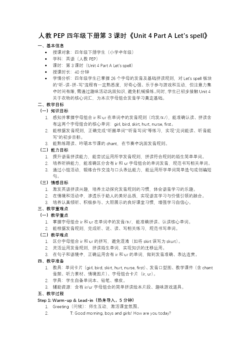 這是人教四年級下冊英語Unit 4"Going Shopping"Part A Let's spell語音教學(xué)課件,共33頁,聚焦字母組合ir/ur的發(fā)音規(guī)則。 導(dǎo)入環(huán)節(jié)通過語音歌謠和worm/work等例詞,自然引入ir/ur發(fā)音學(xué)習(xí),激活學(xué)生語音感知。新知呈現(xiàn)環(huán)節(jié)以小女孩幫助受傷小鳥的趣味故事為載體,串聯(lián)girl、skirt、bird、hurt、first、purple等核心單詞,拆解ir/ur字母組合,明確其均發(fā)/??/的發(fā)音規(guī)則,通過跟讀、chant等形式強(qiáng)化發(fā)音記憶。 練習(xí)環(huán)節(jié)設(shè)計拼寫、分類、聽音圈詞、發(fā)音判斷等多樣練習(xí),鞏固ir/ur的認(rèn)讀與拼寫,訓(xùn)練學(xué)生辨音、拼讀能力??偨Y(jié)與作業(yè)環(huán)節(jié)梳理ir/ur發(fā)音規(guī)律,布置跟讀、創(chuàng)編小故事等作業(yè),實(shí)現(xiàn)語音知識的遷移運(yùn)用。