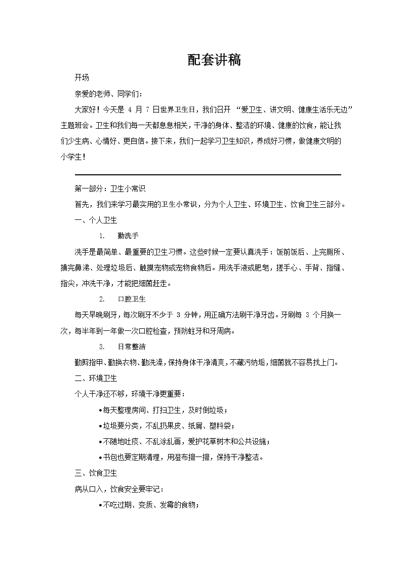 這是一套專為小學低年級設計的衛(wèi)生教育主題班會課件,以"愛衛(wèi)生、講文明、健康生活樂無邊"為主線,緊扣4月7日世界衛(wèi)生日展開。 課件以活潑可愛的卡通形象開場,迅速吸引孩子注意力。內(nèi)容層層遞進:先通過圖文結(jié)合的方式講解個人衛(wèi)生(勤洗手、剪指甲、勤換衣)、口腔衛(wèi)生、環(huán)境衛(wèi)生和飲食衛(wèi)生等基礎常識,讓抽象概念變得直觀易懂;再深入闡釋講衛(wèi)生的重要性,用孩子能理解的語言說明不良習慣如何傳播疾病,而整潔環(huán)境又怎樣守護健康與好心情;隨后聚焦流感、手足口病、諾如病毒等校園常見傳染病,配以防疫圖標,傳授簡單實用的預防方法;最后以"動動小手打掃校園"作結(jié),鼓勵孩子將知識轉(zhuǎn)化為行動,在勞動中養(yǎng)成習慣。 整體風格童趣盎然,邏輯清晰,既符合兒童認知特點,又能有效傳遞健康生活理念,是低年級衛(wèi)生主題班會的優(yōu)質(zhì)素材。