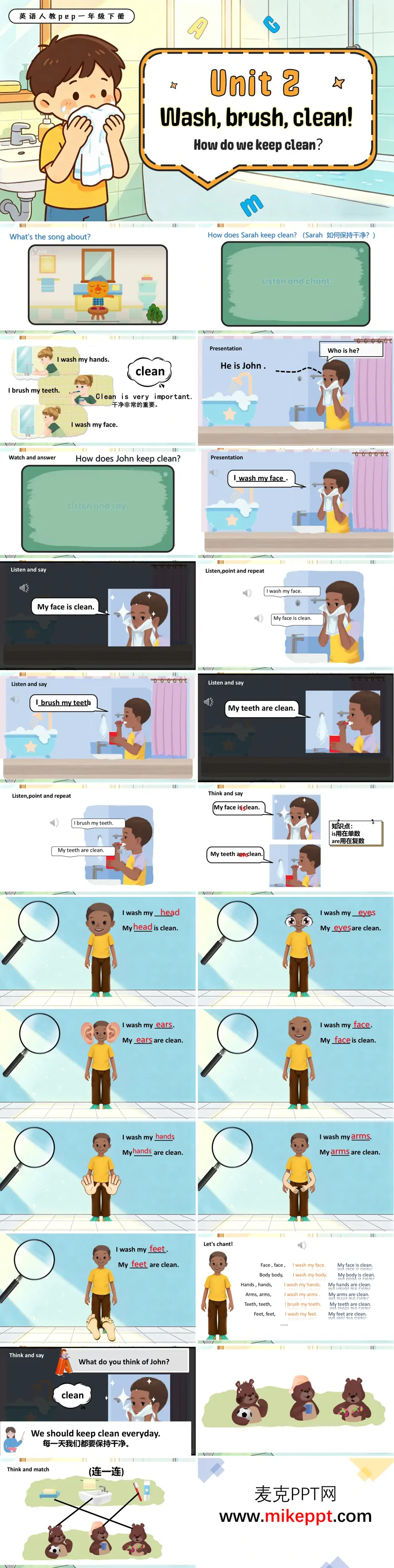 人教PEP一年級下冊英語Unit 2《Wash, brush, clean!》教學課件,以清新浴室卡通風格營造潔凈氛圍,契合低齡學童審美。課件圍繞"如何保持干凈"主題展開:情境導入以動感歌曲激活課堂,引出衛(wèi)生習慣話題;新知呈現(xiàn)講解wash、brush等動作詞匯及身體部位單詞,重點學習"I wash my... My... is/are clean."核心句型,同步辨析is/are的用法差異。趣味操練設(shè)計chant律動、聽指跟讀、連線配對、小組對話、表演展示等多元活動,讓學生在互動中自然習得語言,潛移默化傳遞"保持干凈、愛護身體"的健康理念。分層作業(yè)兼顧不同水平學生,鞏固日常清潔相關(guān)表達。整堂課寓教于樂,既幫助學生掌握洗臉、刷牙等生活場景的英語表達,又培養(yǎng)良好衛(wèi)生習慣,實現(xiàn)語言學習與品格教育的有機融合。