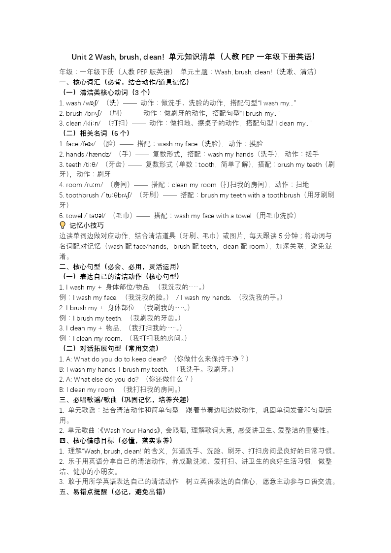 人教PEP一年級下冊英語Unit 2《Wash, brush, clean!》單元復(fù)習課件,延續(xù)清新浴室卡通風格,為低齡學(xué)生營造輕松愉悅的復(fù)習氛圍。課件分三大模塊推進:詞匯短語系統(tǒng)梳理wash、brush、clean等動作詞匯及身體部位單詞,配合趣味互動游戲強化識記;核心句型聚焦"I wash/brush my...""My...is/are clean."等必會表達,精講動詞用法、名詞單復(fù)數(shù)與be動詞的搭配規(guī)則,構(gòu)建清晰語法框架??键c提分針對單元四大重難點,設(shè)計選擇、填空、句型轉(zhuǎn)換等分層練習,由淺入深,既夯實基礎(chǔ)又突破易錯點。整堂課游戲化與知識性并重,幫助學(xué)生全面鞏固日常清潔相關(guān)表達,在復(fù)習語言知識的同時強化"保持干凈、愛護身體"的健康意識。
